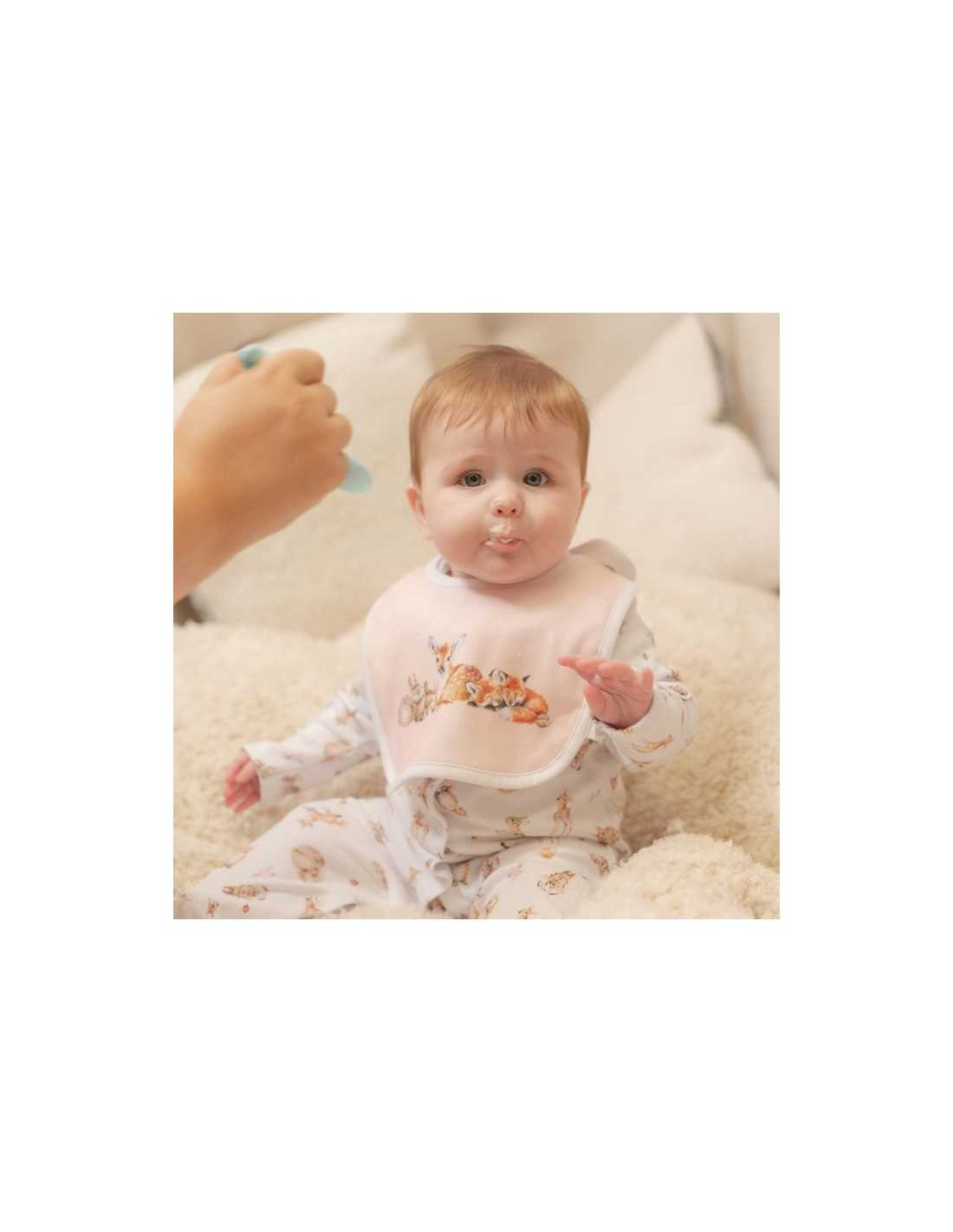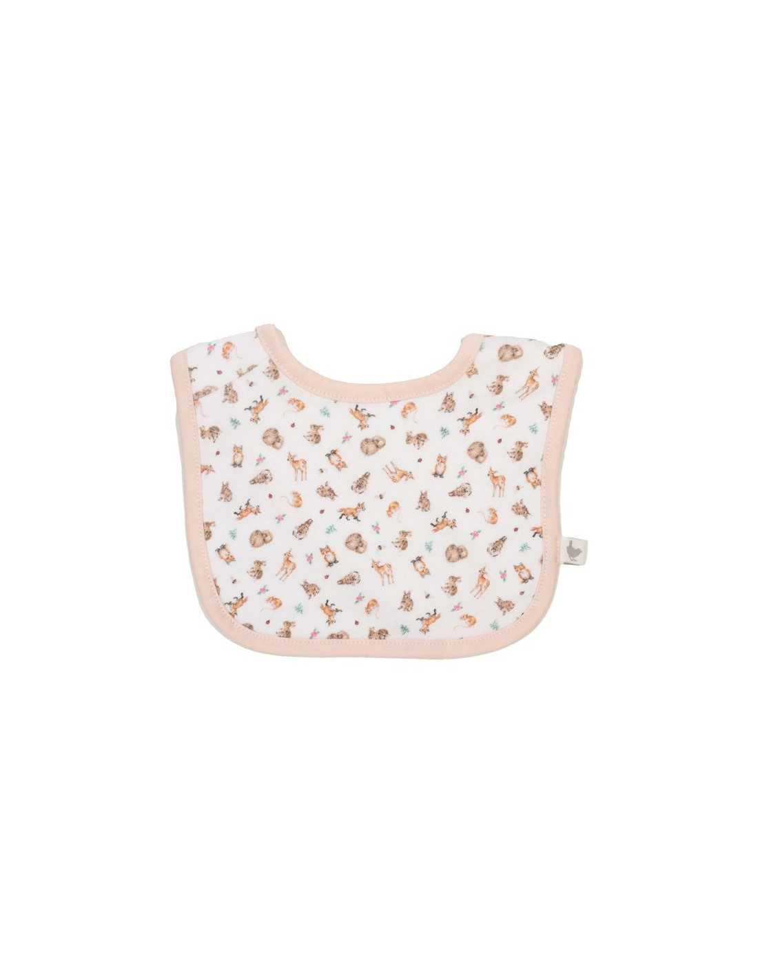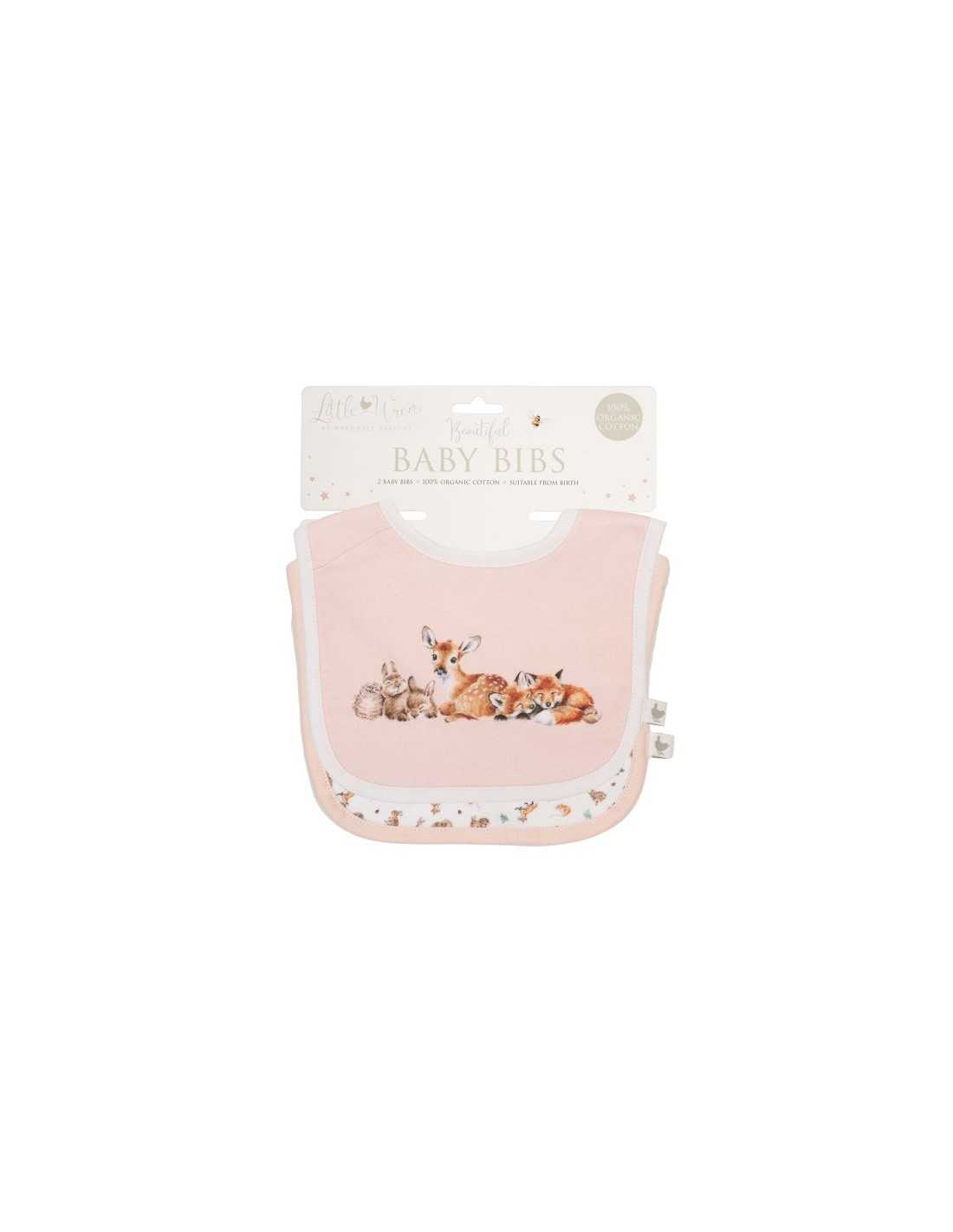 Dette søde gavesæt med hagesmække indeholder to hagesmække lavet af 100% økologisk bomuld med vores dejlige "Little Forest" design. Den ene hagesmæk har et tryk på en lyserød baggrund, mens den anden har mønster over hele overfladen på en hvid baggrund med lyserød kant. Begge hagesmække er med trykknaplukning.