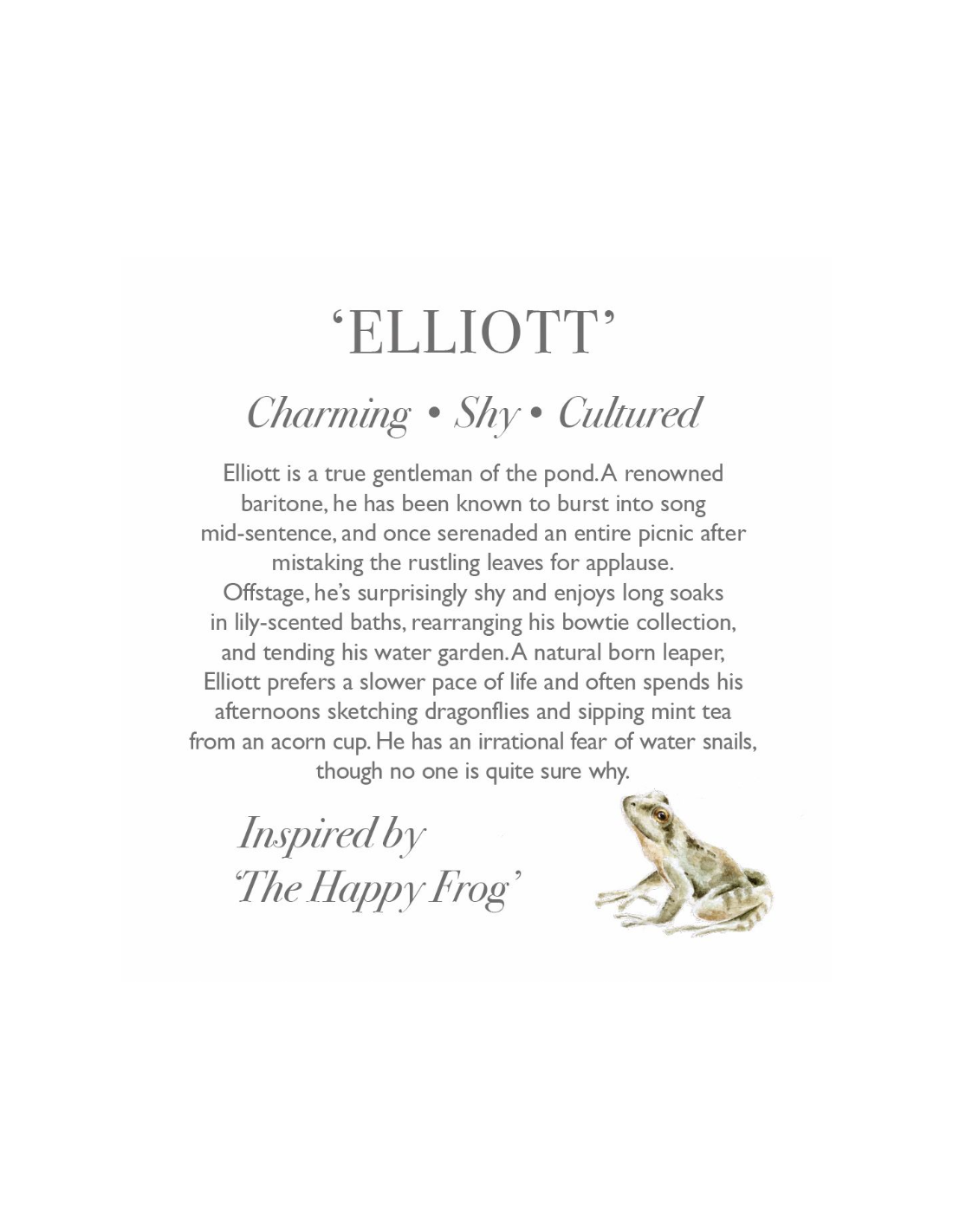 Mød Elliot – en charmerende og blød frø fra vores populære plyskollektion. Figuren er inspireret af designet “The Happy Frog” og leveres med et lille gavemærke, der fortæller om hans baggrund. Hver figur i kollektionen er skabt af nøje udvalgte materialer, som giver et unikt udtryk og en behagelig, blød finish, der afspejler både dyret og Hannahs originale illustrationer.