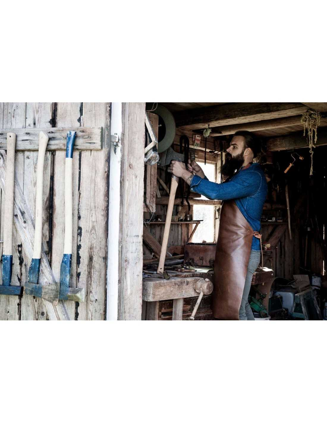 Dette læderforklæde er forsynet med en håndklædestrop og nakkeremmen er forsynet med en "beskyttelsesrem", som gør den behagelig at bære og forhindrer i at skarver i nakken.
